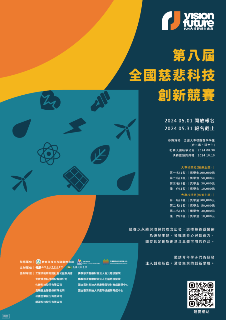 慈濟基金會自2017年起辦理「Fun大視野 想向未來」青年創 新推動計畫,提供青年所需要的支持與舞臺。為鼓勵青年勇於追 逐夢想及自我實踐,舉辦「全國慈悲科技創新競賽」,以「環保 5R」及「聯合國永續發展目標」之願景,鼓勵青年關注環保永續 及慈善醫療等議題,擴大青年之社會影響力。迄今邁入第八屆仍 持續鼓勵大專校院及高中職投稿參賽,競賽以聯合國永續發展目 標(SDGs)為主軸,擇慈善或醫療為研發主題,發揮慈善心與創造 力,開發具足創新創意且具體可用的作品,進而解決上述相關問 題。邀請各校青年學子們為研發注入創意新血,激發無窮的創新 思維。